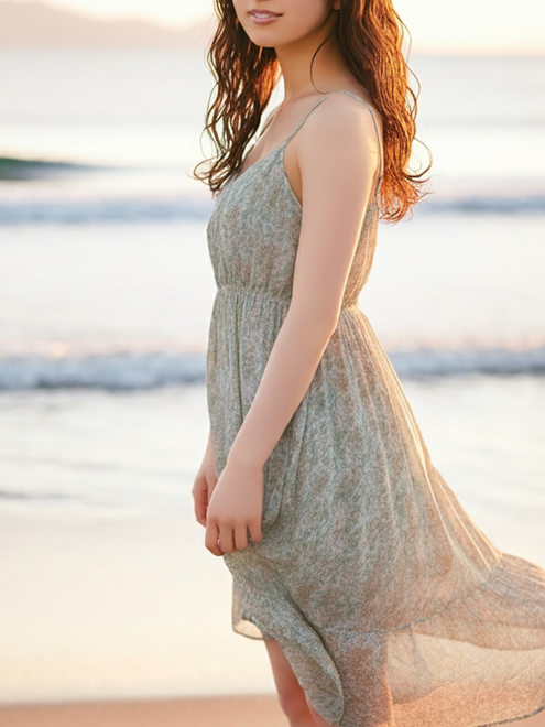 彼女のドレスは、体のラインを強調するボディコンシャスなデザイン。胸元は大胆にカットされ、深く空いたVネックからは豊かに実った胸元が覗き、その谷間がまるで「どうぞ見て」と言わんばかりに、男性の視線を誘い込む罠のようです。ドレスがまとう光沢のある生地は、彼女の全身を優しく包み込み、その肉感的なラインを余すことなく引き立たせています。腰から太ももへと続くその滑らかな曲線は、見れば見るほど目を奪われる誘惑的な美しさを持ち、歩くたびにふわりと揺れるヒップは、まるで官能的なダンスを踊っているかのように、その柔らかさを見せつけてきます。